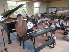 •  ピアニストのチカコシュカさんをお招きし、ピアノ演奏会を開催しました。2年生は「メヌエット」や「トルコ行進曲」のほか、「ミッキーマウスマーチ」や体育祭で踊ったダンス曲「APT.」など、子ども達に馴染みのある曲がたくさん演奏されました。迫力のある演奏に子ども達は笑顔で聞き入ったり、曲に合わせて体を動かしたりしながら、楽しい時間を過ごしました。