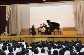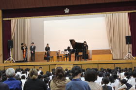•  子ども達は、生の演奏に触れ、音色や音の重なりの美しさを肌で感じることができました。また、クラシックの歴史や楽器の紹介についても丁寧に説明してくださいました。最後には、子ども達もよく知っている「美女と野獣」やMrs.GREENAPPLEの曲を演奏して下さり、音楽に親しむ楽しいひとときとなりました。