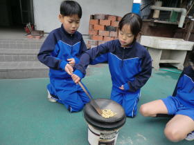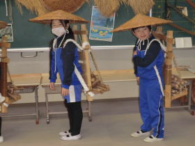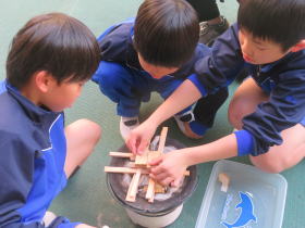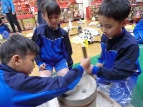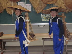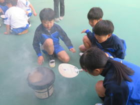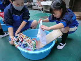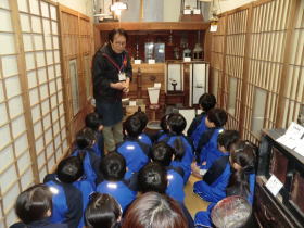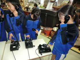 •  社会科「市の様子のうつりかわり」の学習でふるさと学芸館へ行きました。せんたく板での洗濯や火起こし、石臼でのきな粉作りなどを体験しました。昔のくらしについてお話を聞いたり実際に道具を見たり触ったりすることで、昔の人々が、木やかわらなどの自然のものを使って道具を作り、工夫して大事に使いながら暮らしていたことを知ることができました。お風呂に水を汲んでお湯を沸かしたり、振り子時計のゼンマイをまいたりするのは、子どもの仕事だったそうです。